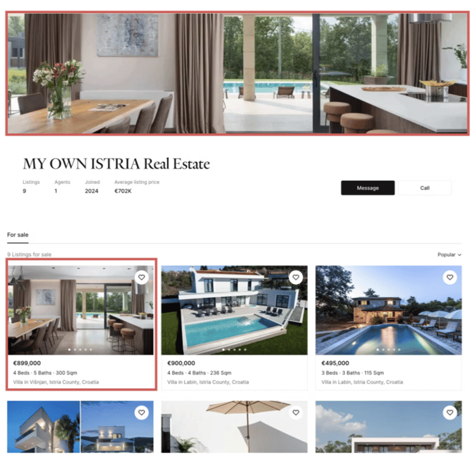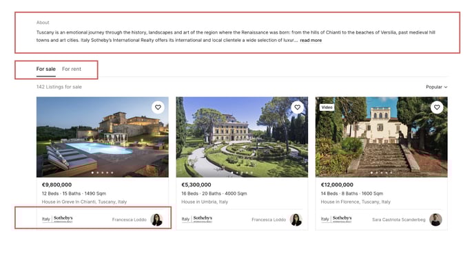 - Listings Tabs: For sale and For rent tabs show your listings with your logo and assigned agent’s headshot.